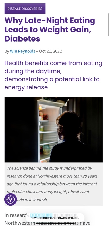 Reynolds, W. (2022, October 21). Why late-night eating leads to weight gain, diabetes. News Center. https://news.feinberg.northwestern.edu/2022/10/21/why-late-night-eating-leads-to-weight-gain-diabetes/