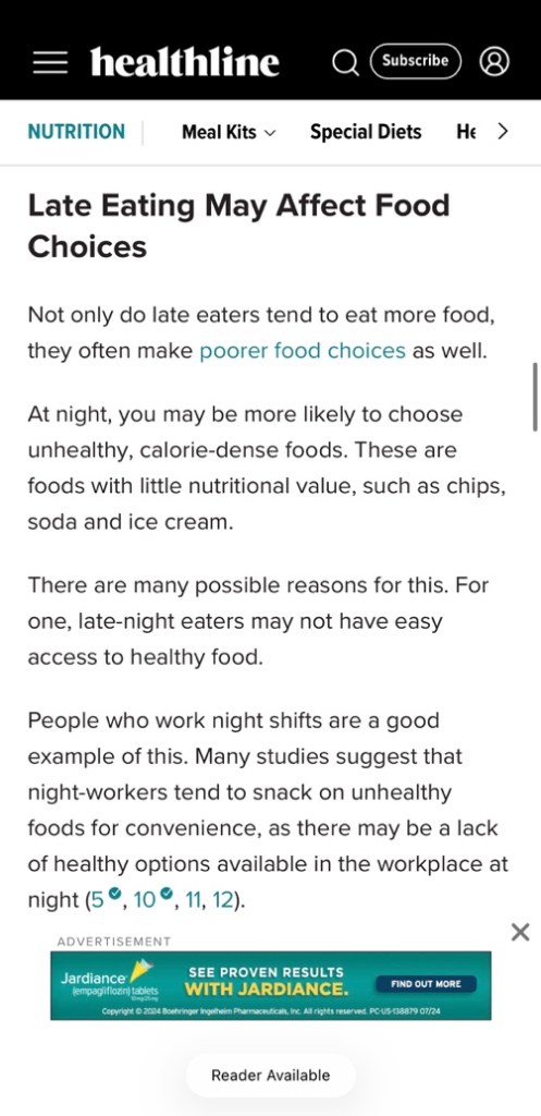I recently came across a TikTok video claiming that eating late at night causes weight gain. I have heard similar advice before, like people saying you should never eat after 8 PM. This claim stood out to me because it is very common and sounds convincing, but it also seemed a little too simple. Weight gain seems like it would depend on more than just the time you eat. The video also did not include any scientific evidence or sources which made me skeptical. So, because of this, I decided to investigate whether this claim is actually true.